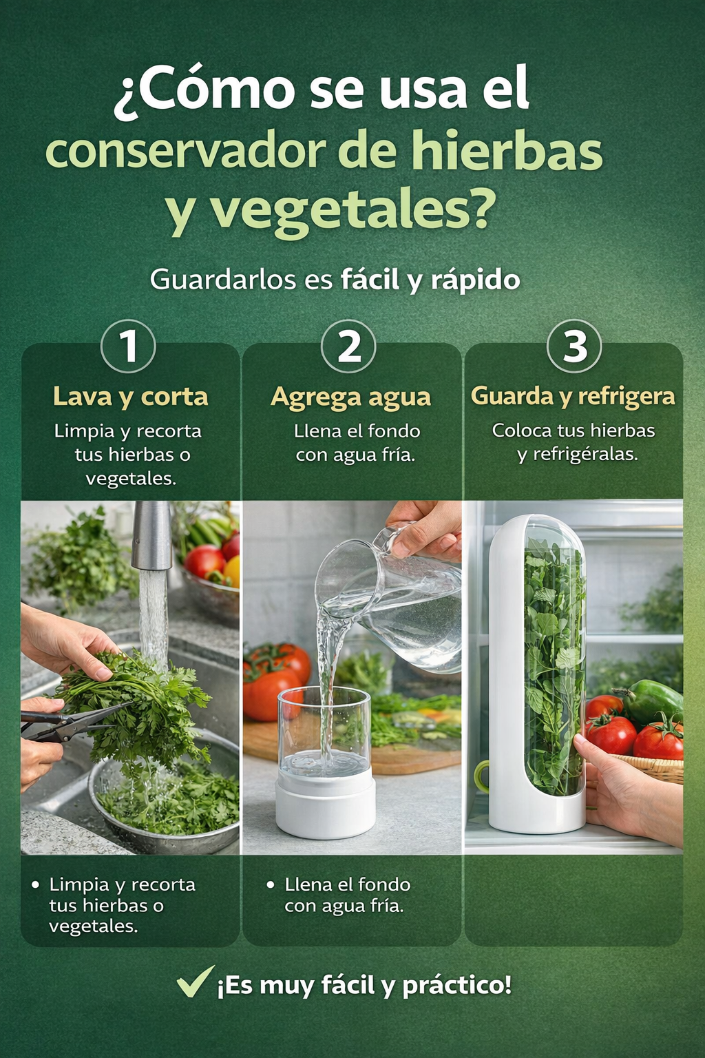 Usar el conservador es rápido y práctico: lava, ,lava, lava y corta. Limpia tus hierbas o vegetales y recorta los tallos. Agrega agua. Llena la base con un poco de agua fresca. Guarda y refrigera: Coloca las hierbas dentro y llévalo a la nevera. 👉 Así mantienes la frescura por más tiempo sin esfuerzo.