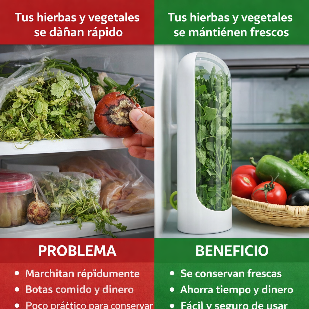 ¿Tus hierbas y vegetales se dañan rápido aunque los guardes en la nevera?Se marchitan en pocos díasPierden frescura, sabor y nutrientesTerminas botando comida y perdiendo dinero👉 Esto genera desperdicio constante y compras innecesarias.
