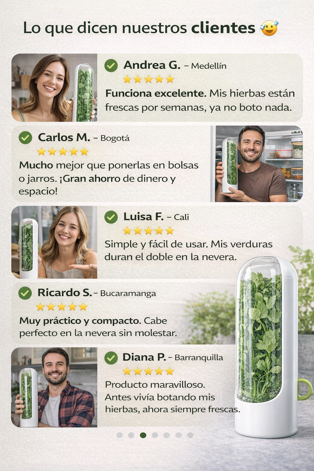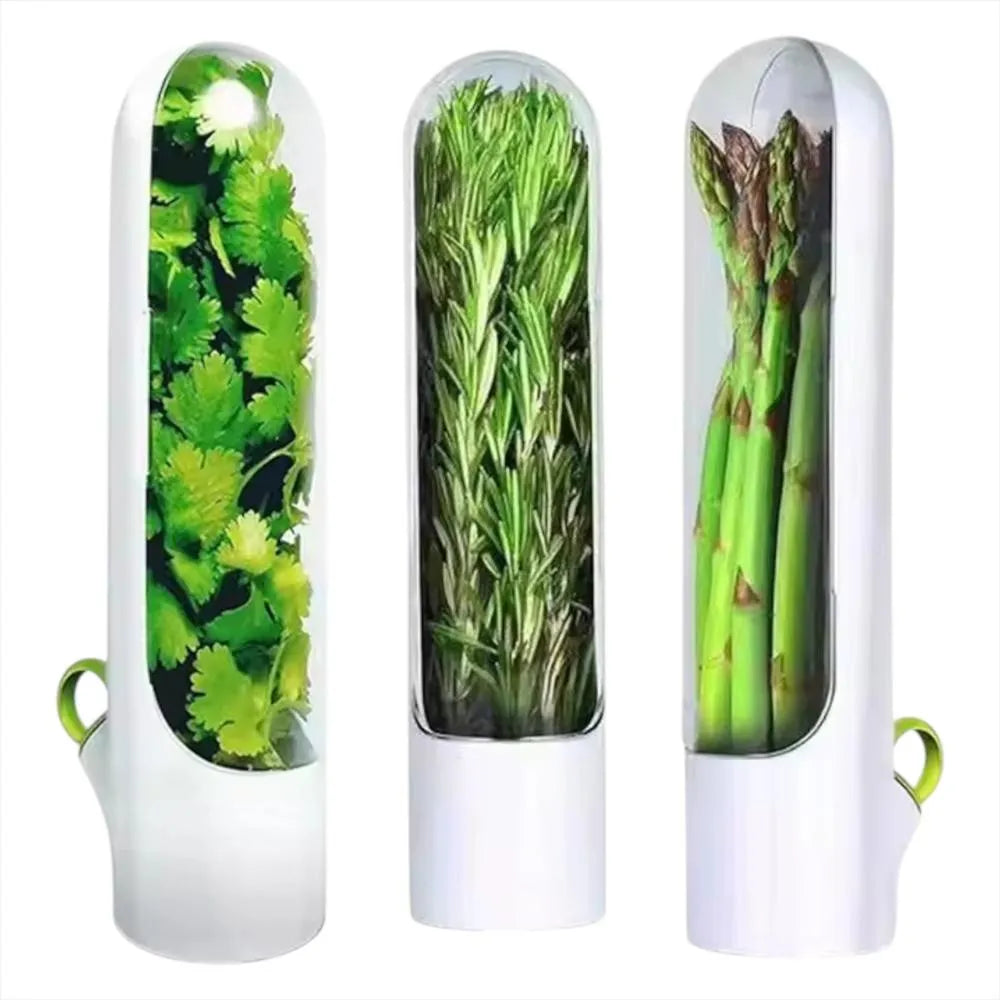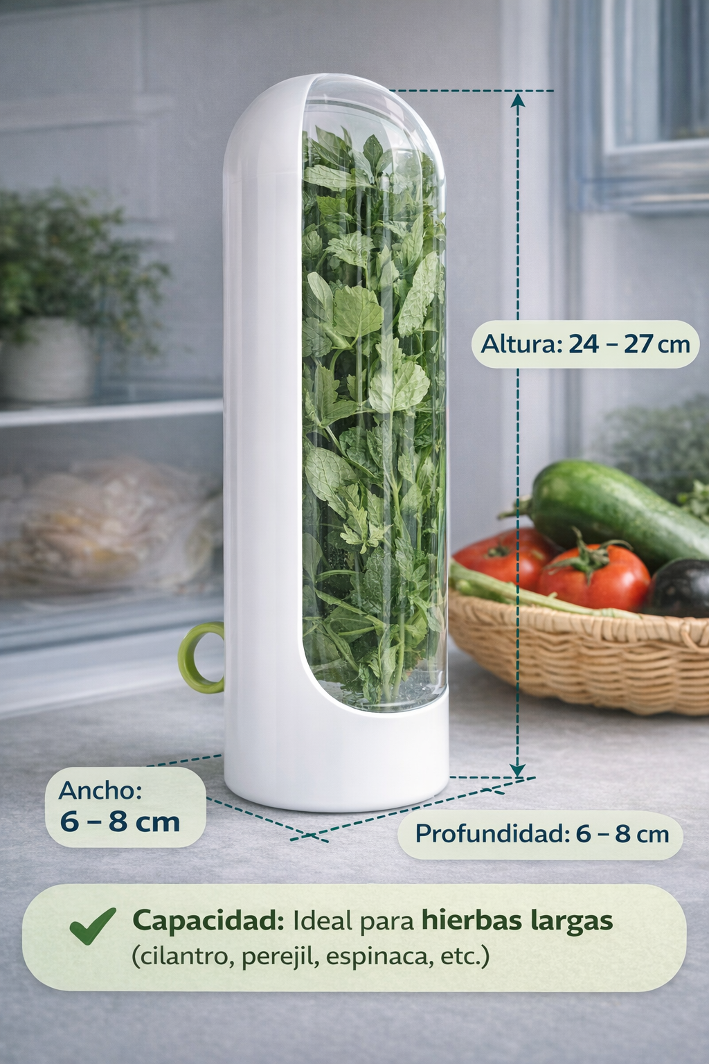 📏 Medidas aproximadas del conservador: Altura: 24–27 cm, Ancho: 6–8 cm, Profundidad: 6–8 cm. Capacidad ideal para hierbas largas (cilantro, perejil, espinaca, etc.)