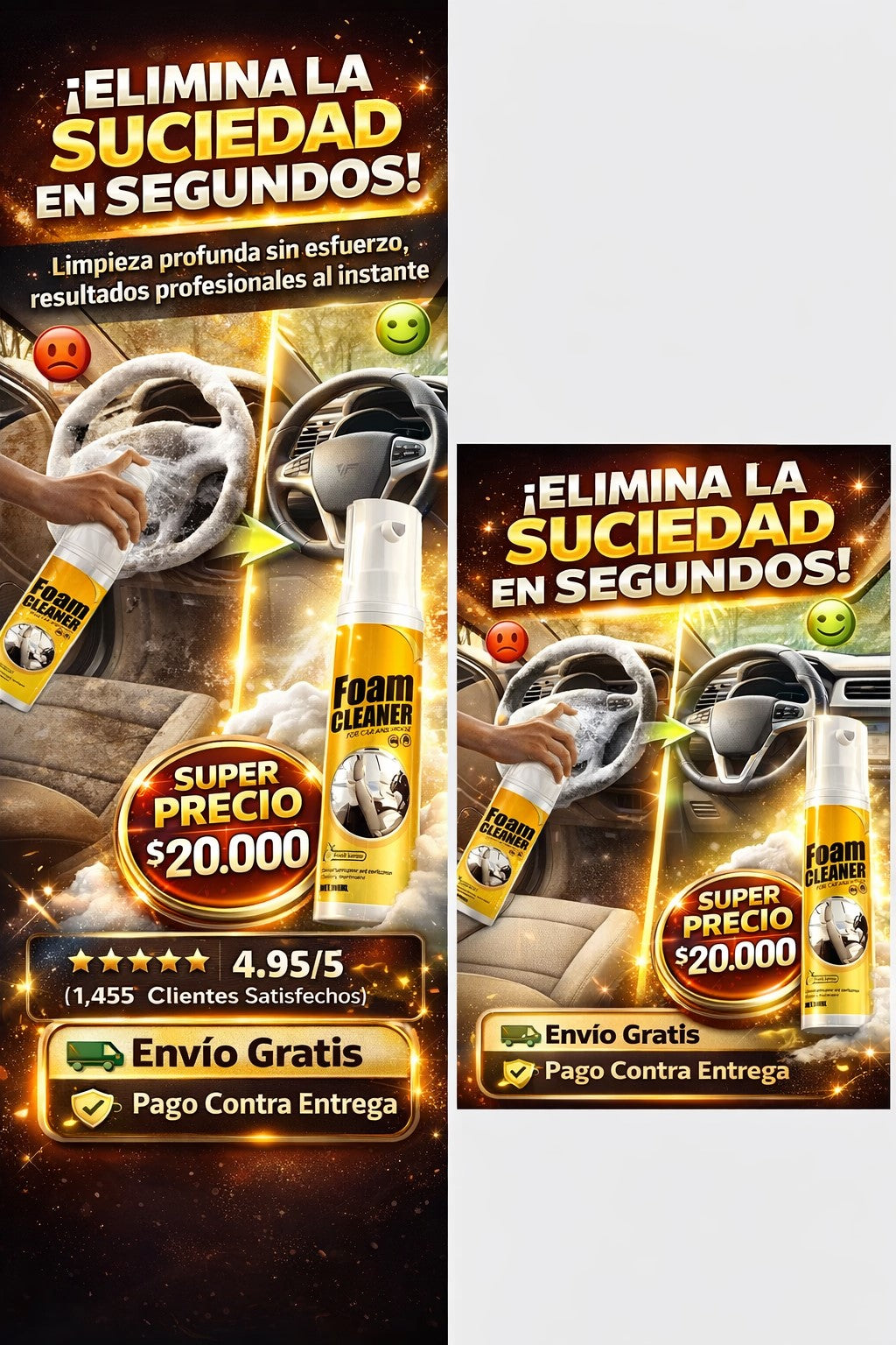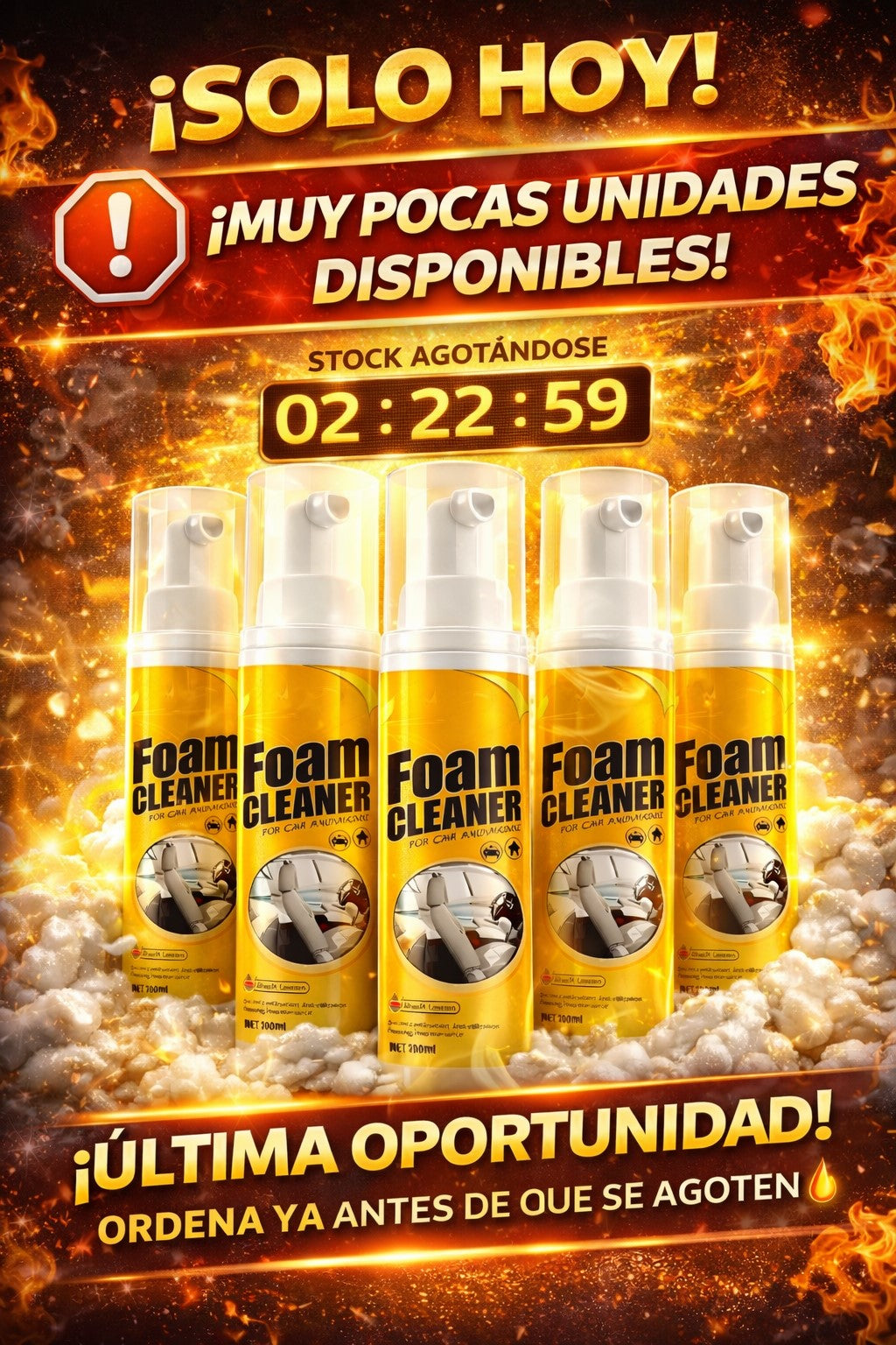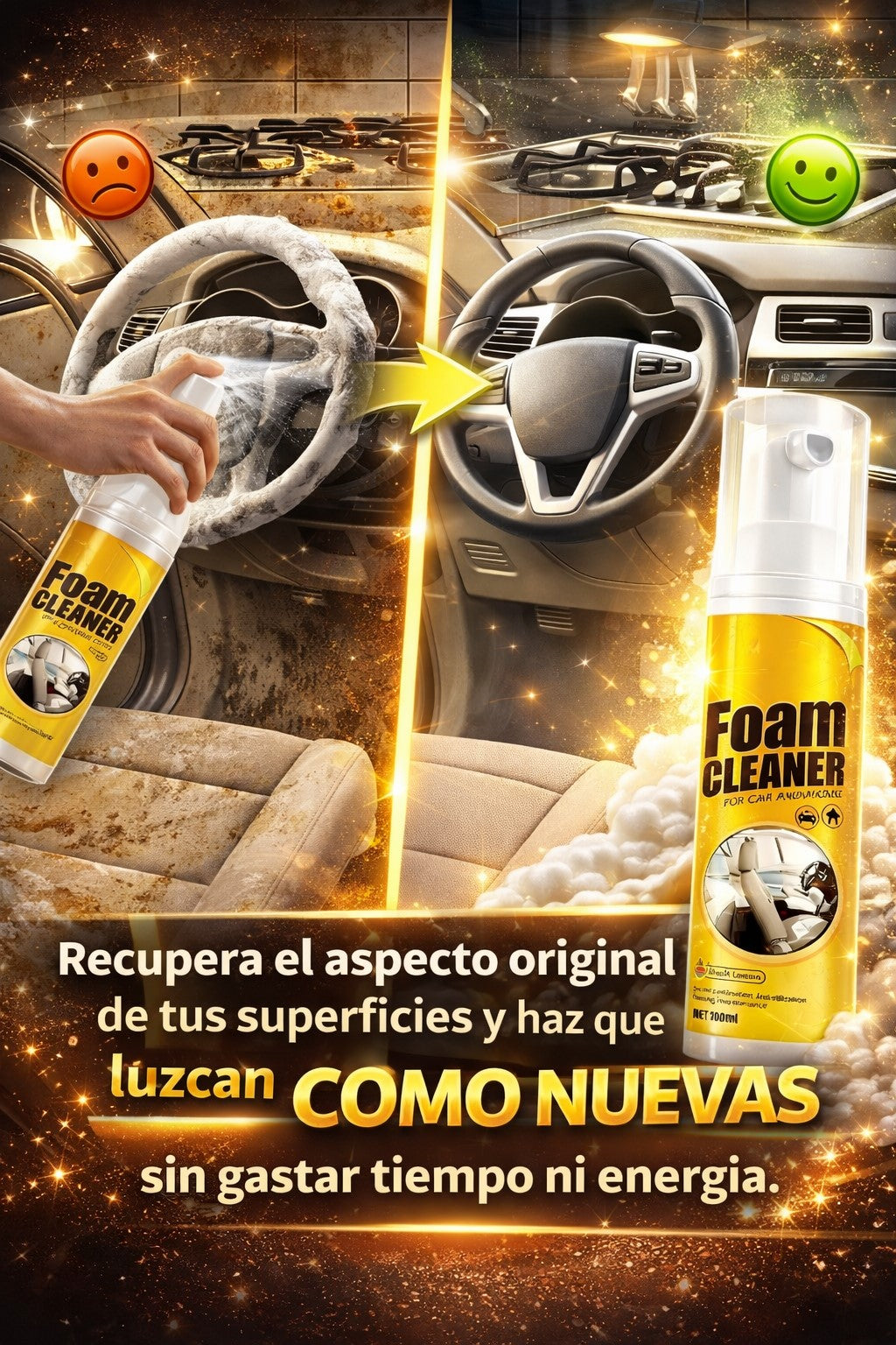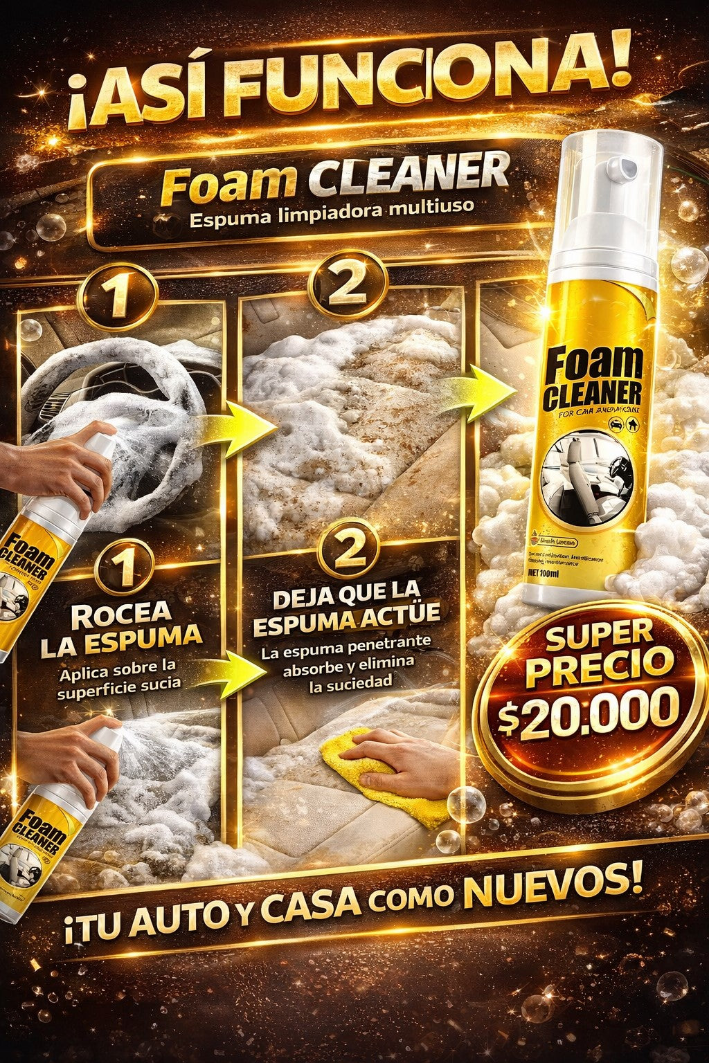 🗣️ “Quedé sorprendido con el resultado”. “Tenía manchas viejas en los asientos de mi carro y pensé que no saldrían… apliqué el Foam Cleaner y en segundos desaparecieron. ¡Quedó como nuevo! 🗣️ “Demasiado fácil de usar”. “Solo rocié, esperé un poco y limpié… sin esfuerzo. Es el mejor producto que he probado para limpiar sin complicarme.” 🗣️ “Vale totalmente la pena”. “La uso en mi casa y en el carro, limpia increíble y deja todo con un aspecto renovado. Definitivamente la volvería a comprar.”